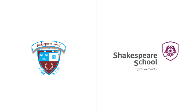 The new visual identity uses and simplifies 2 elements used in the old brand identity, the shield and the English rose, a heraldic symbol that speaks about “englishness”. The English rose is already present in the interior ornaments of the central headquarters of the school, and the color chosen for the new school identity reminds of the color of the 1st center opened by Shakespeare School.